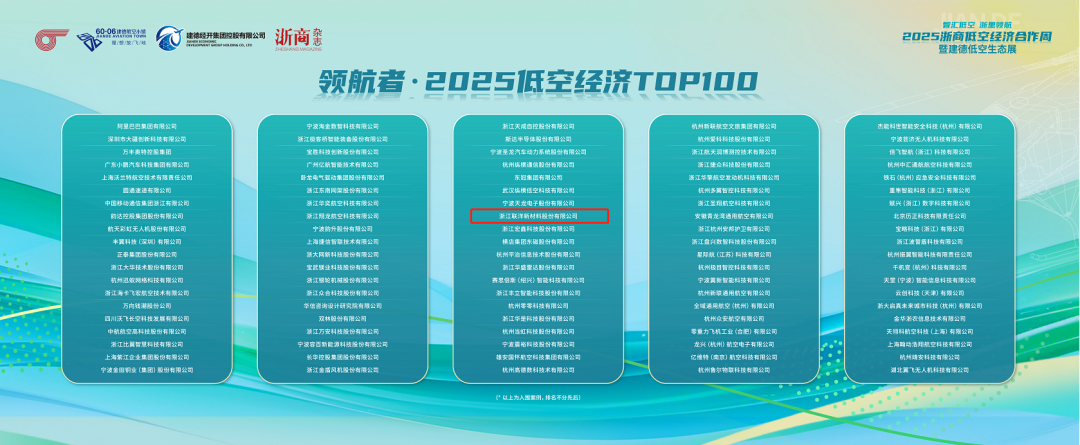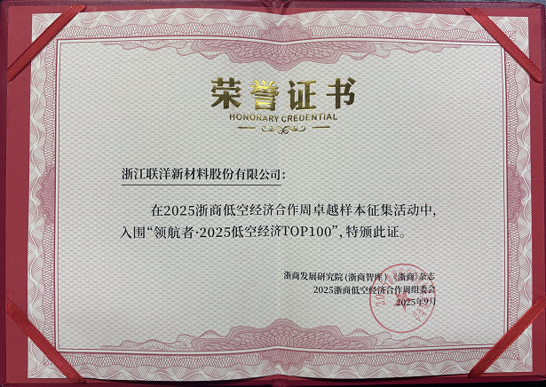 近日,浙江联洋新材料股份有限公司成功入选"领航者·2025低空经济TOP100"榜单。该奖项于2025年9月18日-19日在杭州建德市举行的"2025浙商低空经济合作周主报告会暨建德低空生态展开幕式"上正式发布。